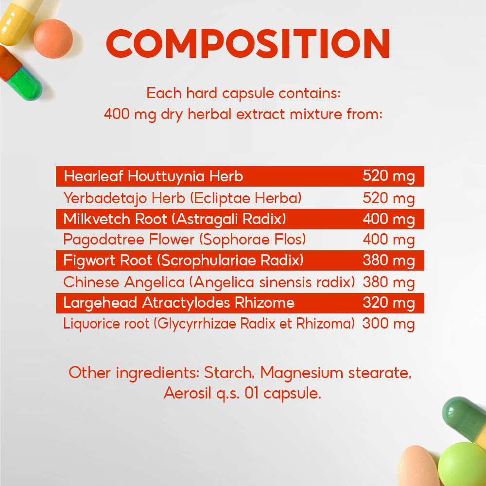 - 400mg dry extract of mixed herbs (equivalent to dry herbs):