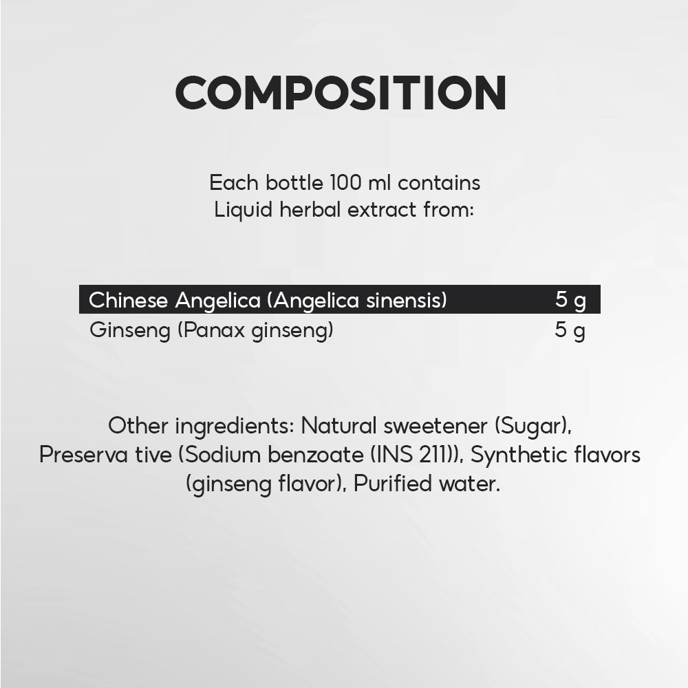 Excipients: Natural sweetener (rock sugar), preservative (sodium benzoate (INS 211)), synthetic flavor (ginseng flavor), purified water to make up the required volume.