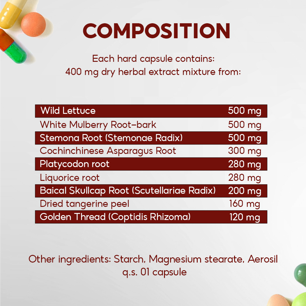 - Helps reduce excessive phlegm secretion.