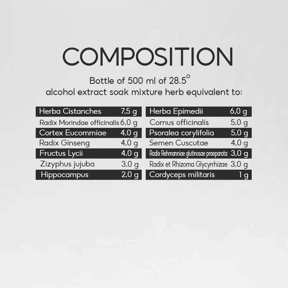 - Herba Cistanches (Wüsten-Zistanchenkraut), Radix Morindae officinalis (Noniwurzel), Herba Epimedii (Ziegenkraut), Radix et Rhizoma Glycyrrhizae (Süßholzwurzel), Hippocampus (Seepferdchen): Helfen, die Nieren zu tonisieren, die Yang-Energie zu stärken und die männliche physiologische Funktion zu verbessern.