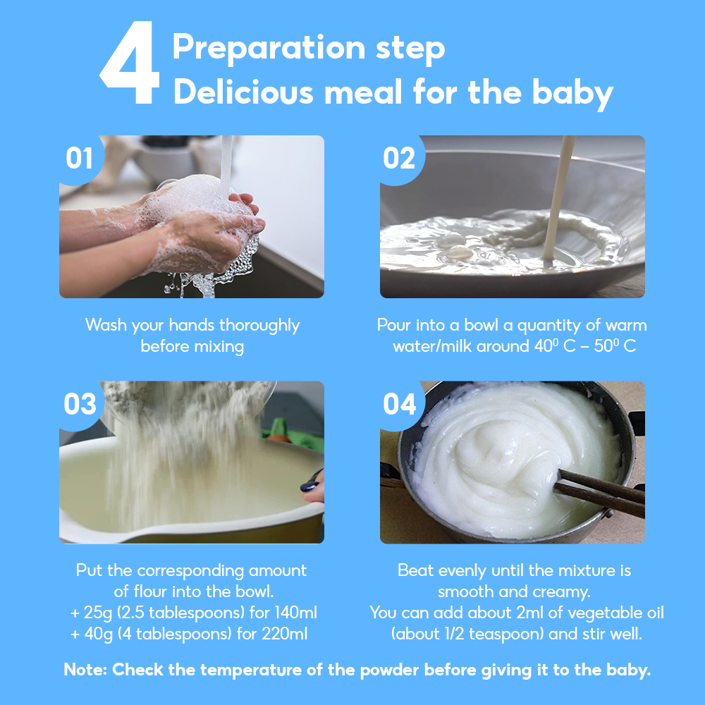 Dieses Produkt ist sehr einfach zuzubereiten und spart vielbeschäftigten Müttern Zeit. Sie können Humababy Beikost mit verschiedenen Obst- und Gemüsesorten kombinieren, um abwechslungsreiche Mahlzeiten zu kreieren und zu verhindern, dass Ihrem Baby langweilig wird.
