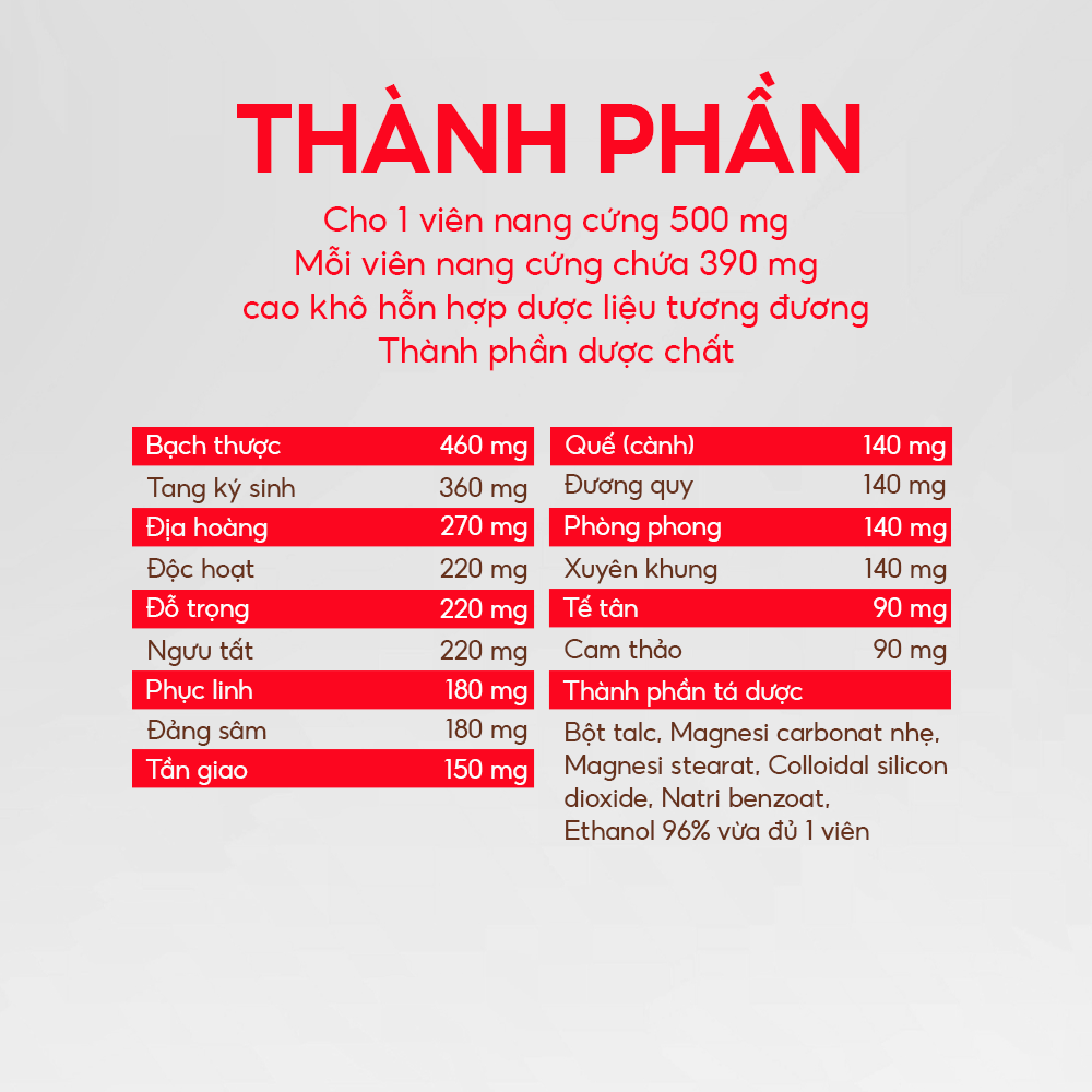 Eukalyptus 460 mg; Parasitärer Tang 360 mg; Kaiser 270 mg; Giftig 220 mg; Do Trong 220 mg; Klettensocken 220 mg; Phu Linh 180 mg; Party Ginseng 180 mg; Qin Jiao 150 mg; Zimt 140 mg; Aktuell 140 mg; Zimmer 140 mg; Durchstechend 140 mg; Te Tan 90 mg; Süßholz 90 mg; Der sonstige Bestandteil beträgt nur 1 Tablette.