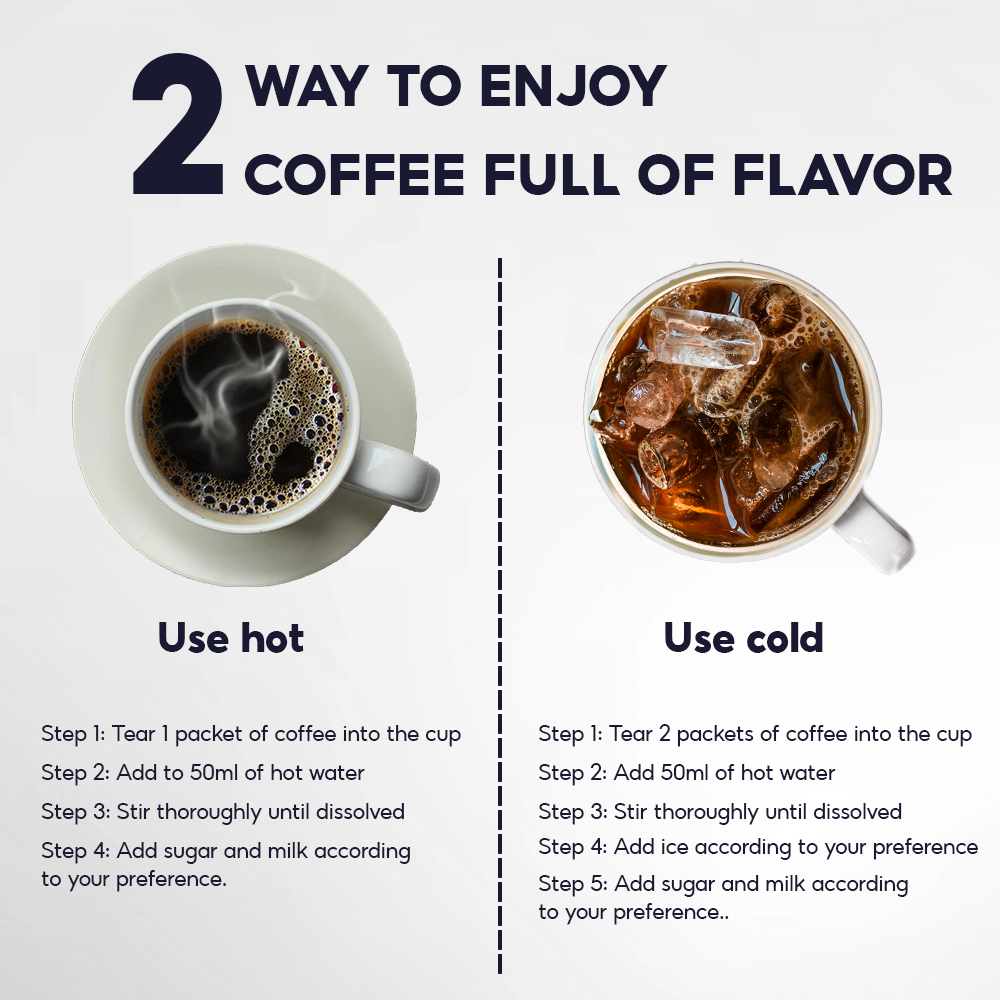 - Hot: Mix 1 sachet of Dreamland Energy coffee with 50ml of hot water and stir well.