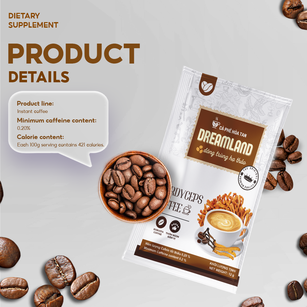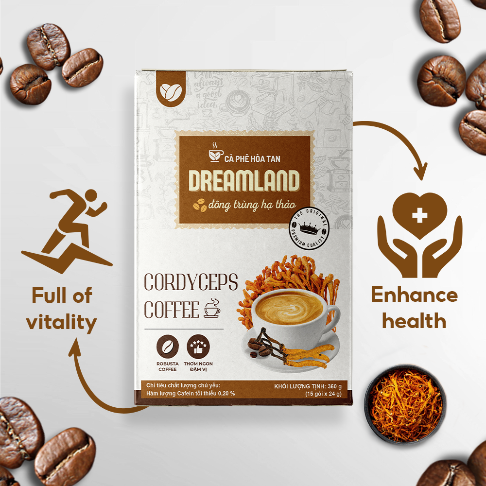 Description: Made with premium Robusta coffee beans and Cordyceps sinensis extract, Dreamland Cordyceps Coffee offers a refined taste for coffee lovers.