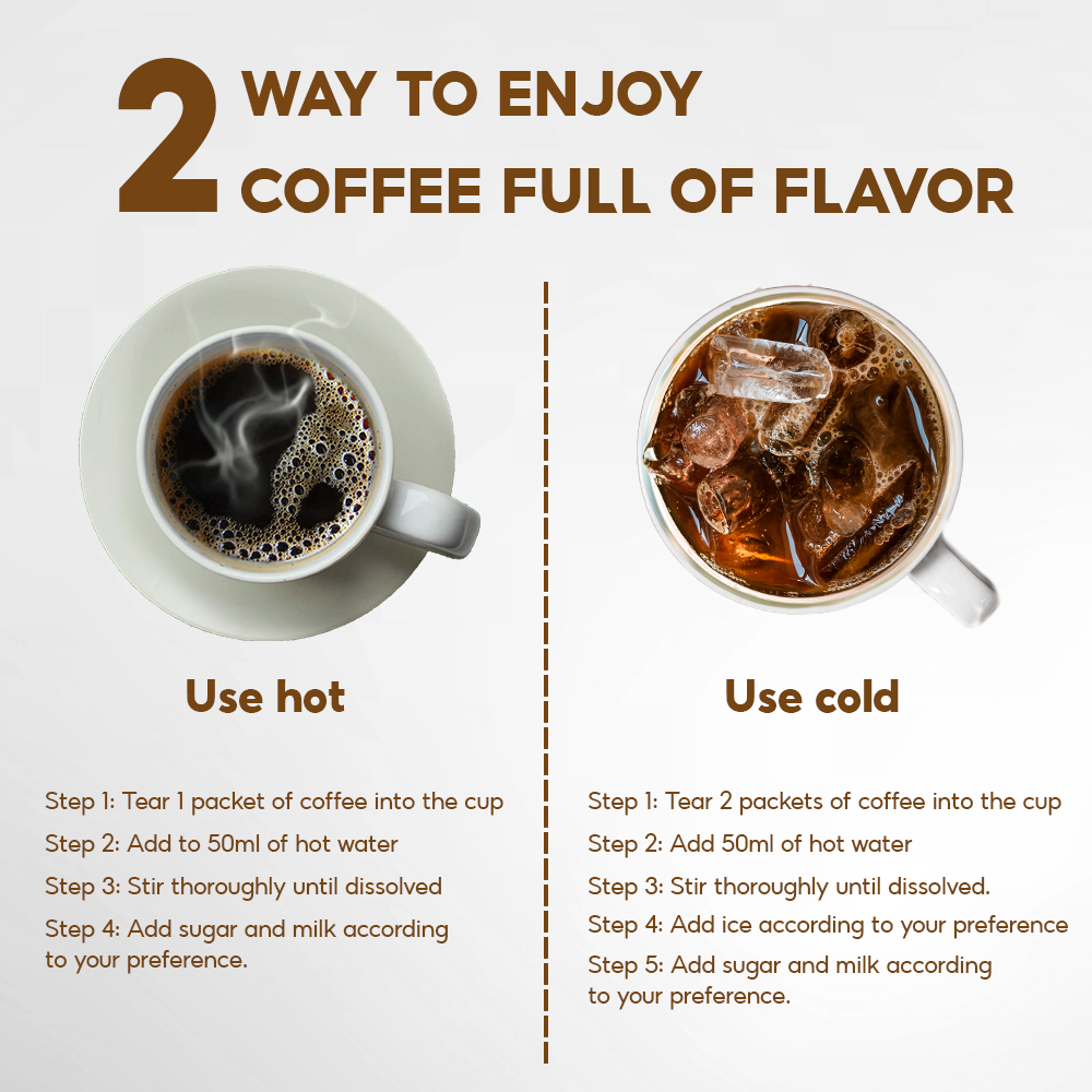 - Hot: Mix 1 sachet with 50ml of hot water (80°C - 100°C), stir well and enjoy.