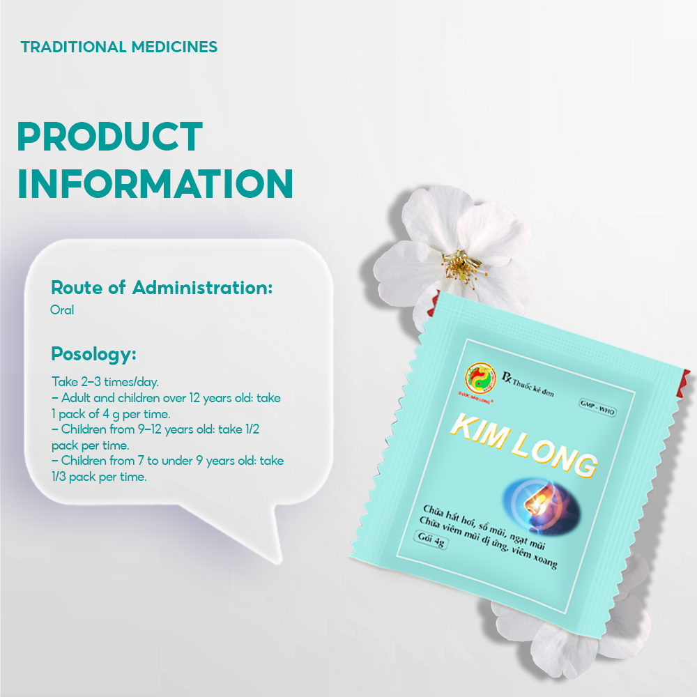 Each 4 g pack of hard pills contains: · Rehmannia glutinosa 0,60g · Akebia quinata 0,60g · Scrophularia ningpoensis 0,60g · Xanthium strumarium 0,60g · Glycyrrhiza uralensis 0,56g · Eclipta prostrata 0,56g · Talc powder - sufficient quantity to make 4,00g Dosage Form: Hard pill Description: Spherical, off-white color, gray core, aromatic herbal smell, slightly bitter taste. Effects: Reject toxic air and clear vessels and pulses; strengthen blood and neutraliz-es the heat temperature in body; purify blood and removes toxic elements Indications: ments Therapeutic indications: Treatment for sneezing, runny nose, blocked nose, pain on face and nose, epistaxis, allergic rhinitis, acute and chronic sinusitis. Dosage and Administration: · Dosage: o Adults and children over 12 years old: 1 packet 4g per time. o Children 7-9 years old: 1/3 packet 4g per time. o Children 9-12 years old: 1/2 packet 4g per time. · Frequency: 2-3 times daily. · Administration: Take after meals. Contraindications: Not suitable for individuals with Yang deficiency, cold constitution, or hypersensitivity to any of the ingredients. Warnings and Precautions: · Do not exceed the recommended dosage. · Avoid concurrent use with other medications. · Not recommended for pregnant women. Effects on Driving and Operating Machinery: No evidence of impairment. Interactions: · Avoid spicy and greasy foods. · Due to a lack of interaction studies, do not mix with other medications. If using other medications, take them at least 2 hours apart. Adverse Effects: No adverse reactions have been reported. Overdose: No reports of overdose. Do not exceed the recommended dosage. In case of overdose, monitor closely and seek medical attention. Packaging: Box of 10 packets x 4g Storage: Store in a cool, dry place, away from sunlight, below 30°C. Shelf Life: 24 months from the manufacturing date. Quality Standard: Manufacturer's standard. Keep out of reach of children. Read the instructions carefully before use. Consult a doctor if you need further information. Report any adverse effects to your doctor or pharmacist. Product Registration Number: VD-30994-18 Drug Information Approval Number: 4e/2024/XNTT/YDCT Manufacturer: CÔNG TY TNHH ĐÔNG NAM DƯỢC BẢO LONG Address: No. 02, Road 430, Hamlet 1, Phuoc Vinh An Commune, Cu Chi District, Ho Chi Minh City, Vietnam. Phone: (028) 3792 2993 – (028) 3792 2994 Fax: (028) 3792 2991 |