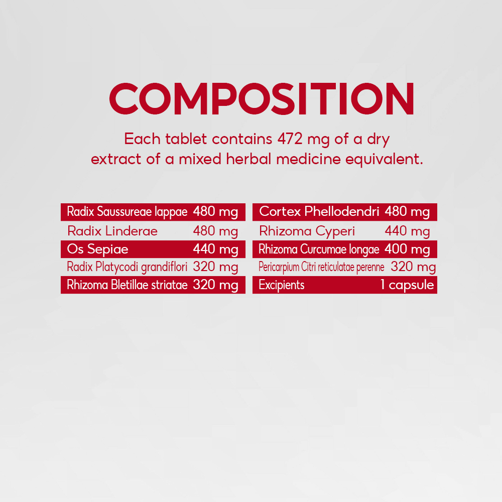 Each hard capsule contains 472 mg of dry herbal extract mixture from: