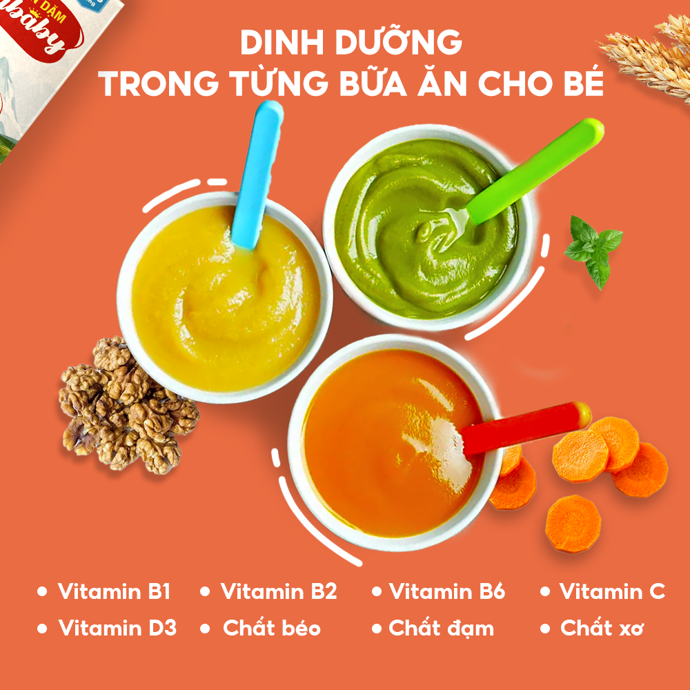 Thành phần: Bột gạo 50%, bột bắp 30%, bột óc chó 5%, bột cà rốt 2%, bột khoai lang, Vitamin B1 (Thiaminchloride hydrochloride), Vitamin B2 (Riboflavin), Niacin (Nicotinamide), Pantothenic acid (Calcium - D-pantothenate), Vitamin B6 (Pyridoxine hydrochloride), Folic acid (N-Pteroyl - L-glutamic acid), Vitamin B12 (Cyanocobalamin), Vitamin C (L-Ascorbic acid), Vitamin A (all trans Retinol), Vitamin D3 (Cholecalciferol), Vitamin E (D-alpha - Tocopherol).