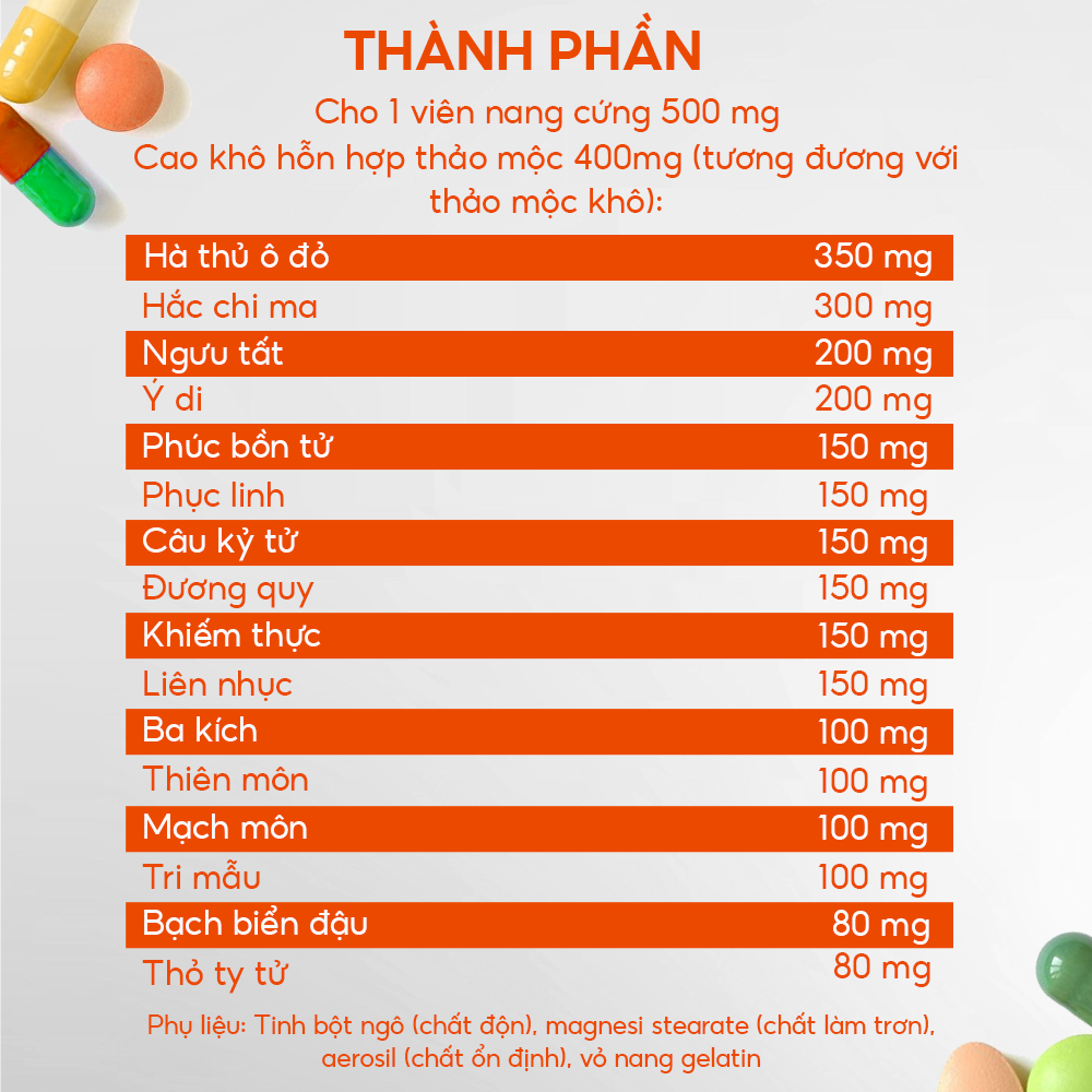 Cho mỗi viên nang cứng 500 mg: Chứa 400 mg cao khô hỗn hợp thảo mộc (tương đương với thảo mộc thô)