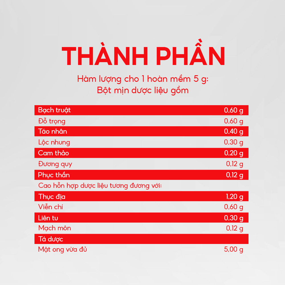 Thành phần: Mỗi viên hoàn mềm 5 g chứa: