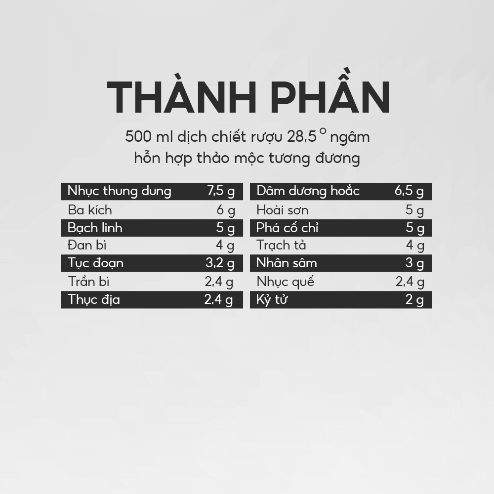 Quy Trình Sản Xuất Kỹ Lưỡng: sản xuất bởi nhà máy Bảo Long Đạt chuẩn GMP-WHO theo quy trình truyền thống kết hợp với công nghệ hiện đại, đảm bảo giữ nguyên giá trị dược liệu và hương vị đặc trưng. Sản phẩm là kết tinh của sự tỉ mỉ, cẩn trọng trong từng giai đoạn, từ chọn lọc nguyên liệu, ngâm ủ đến chưng cất.