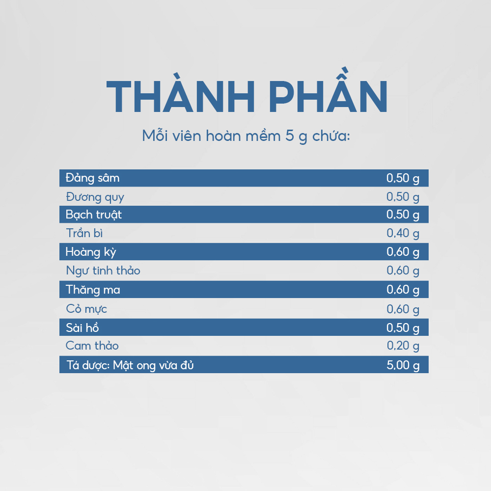 Mỗi viên hoàn mềm 5 g chứa: Đảng sâm 0,5g; Đương quy 0,5g; Bạch truật 0,5g; Trần bì 0,4g; Hoàng kỳ 0,6g; Ngư tinh thảo 0,6g; Thăng ma 0,6g; Cỏ mực 0,6g; Sài hồ 0,5g; Cam thảo 0,2g; Mật ong vừa đủ 5,00 g.